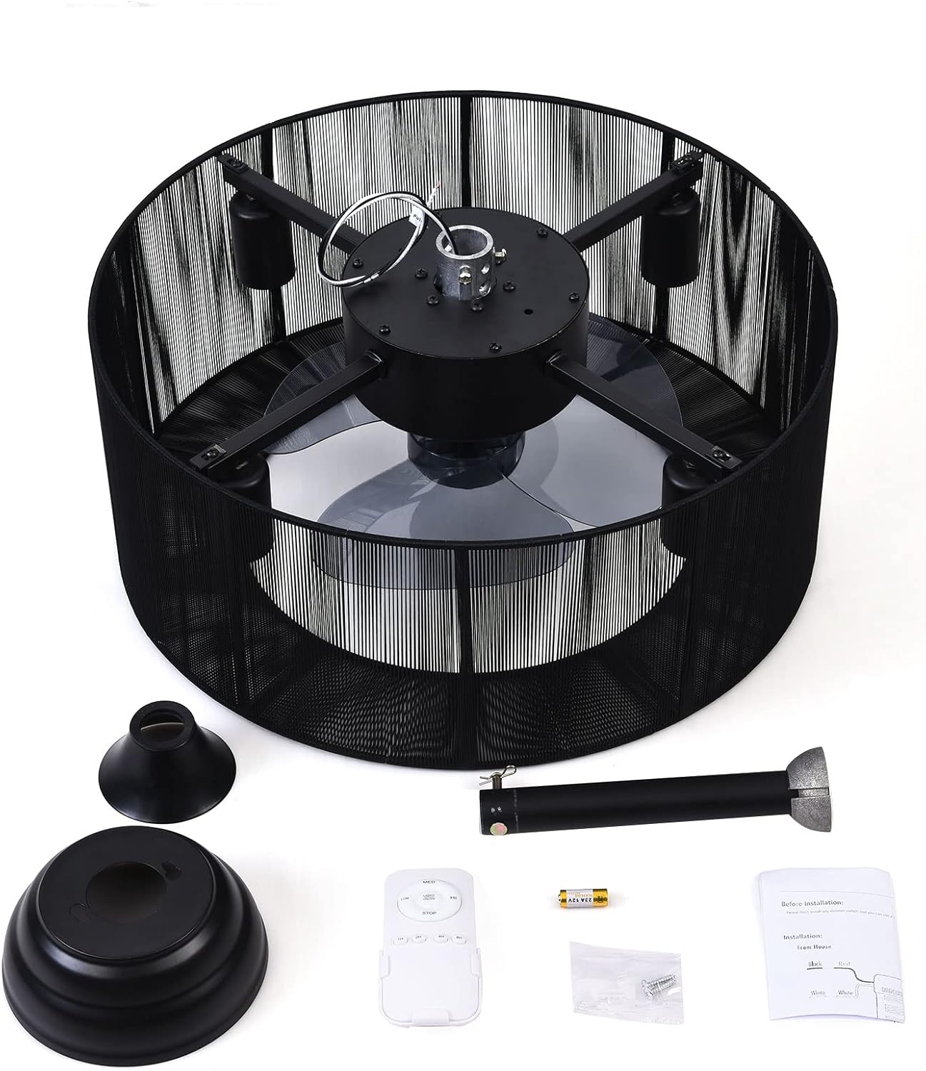 Features:The exterior Nylon wire lampshadea stylish theme while protecting the light bulb and the central fan blade. It's perfect for a loft or office space, hang in your eating area and enjoy the cool breeze.Light & Fan—This American Vintage ceiling fan with is designed for who need marvelous update for your house. Suit for from Room Size 26.2ft*49.2ft, and room from 8-15㎡like children room, bedroom, kitchen island or dinning room。Easy to install: hard wire. perfect design to illuminate your space, whether it is a kitchen island, dining room, bedroom, foyer or any other place.Specification:✦DimensionsFixture Height:7.08" (18 cm)Fixture Width: 18 "(46cm)✦Bulb InformationBulb requirements: use (4) E26bulbs, maximum 60watts, options include incandescent, fluorescent, LED, halogen, etc. (bulbs are not included)Wattage: Max 60WVoltage: AC110-120VRemote control: yes✦Material and ColourMaterial: metal+Nylon wire lampshadeApplicable scenarios: The chandelier is suitable for home and commercial spaces,such as living room, dining room, kitchen island, bedroom, foyer, farmhouse , bar, restaurant, gallery, exhibition room, hotel, coffee shop, office。Package Included:1 *Fan Light (Bulbs Not Included)2*Down rods (12CM & 25CM)1 * Accessories package1 * User Manual✦Suggestion:1. For a safe and secure installation, please ensure that the electrical box to which this fixture will be mounted is properly attached to a structural member of the building.2. All wires are connected. When unpacking, be careful not to pull with wires as a bad connection may result.3. Do not connect electricity until your fixture is fully assembled.