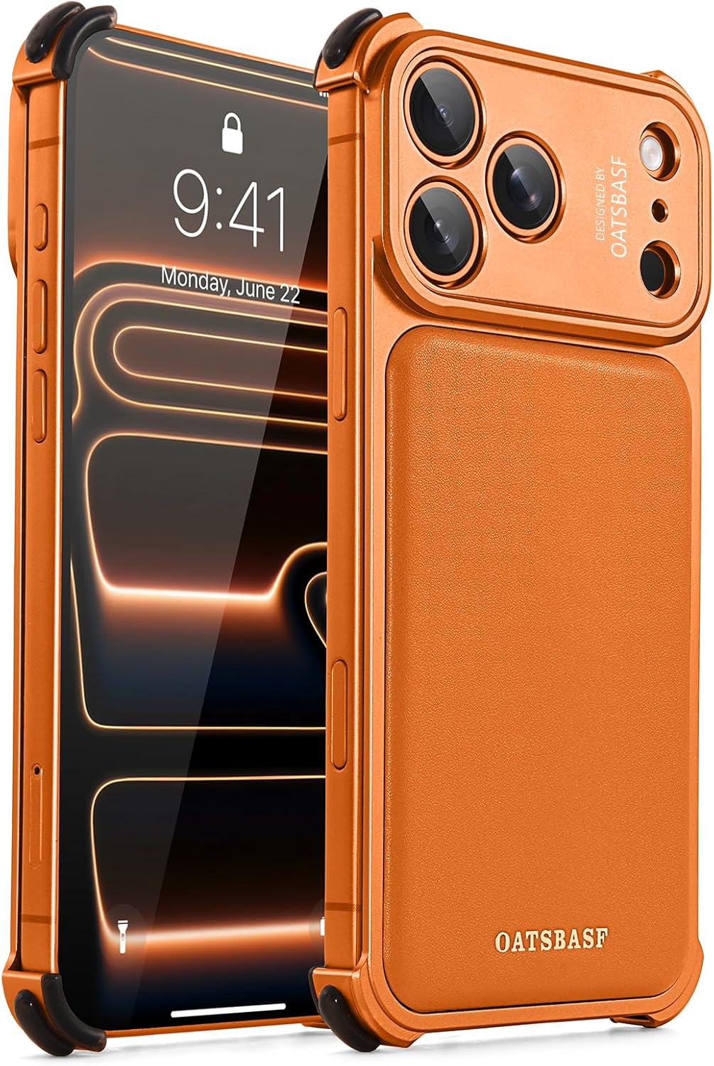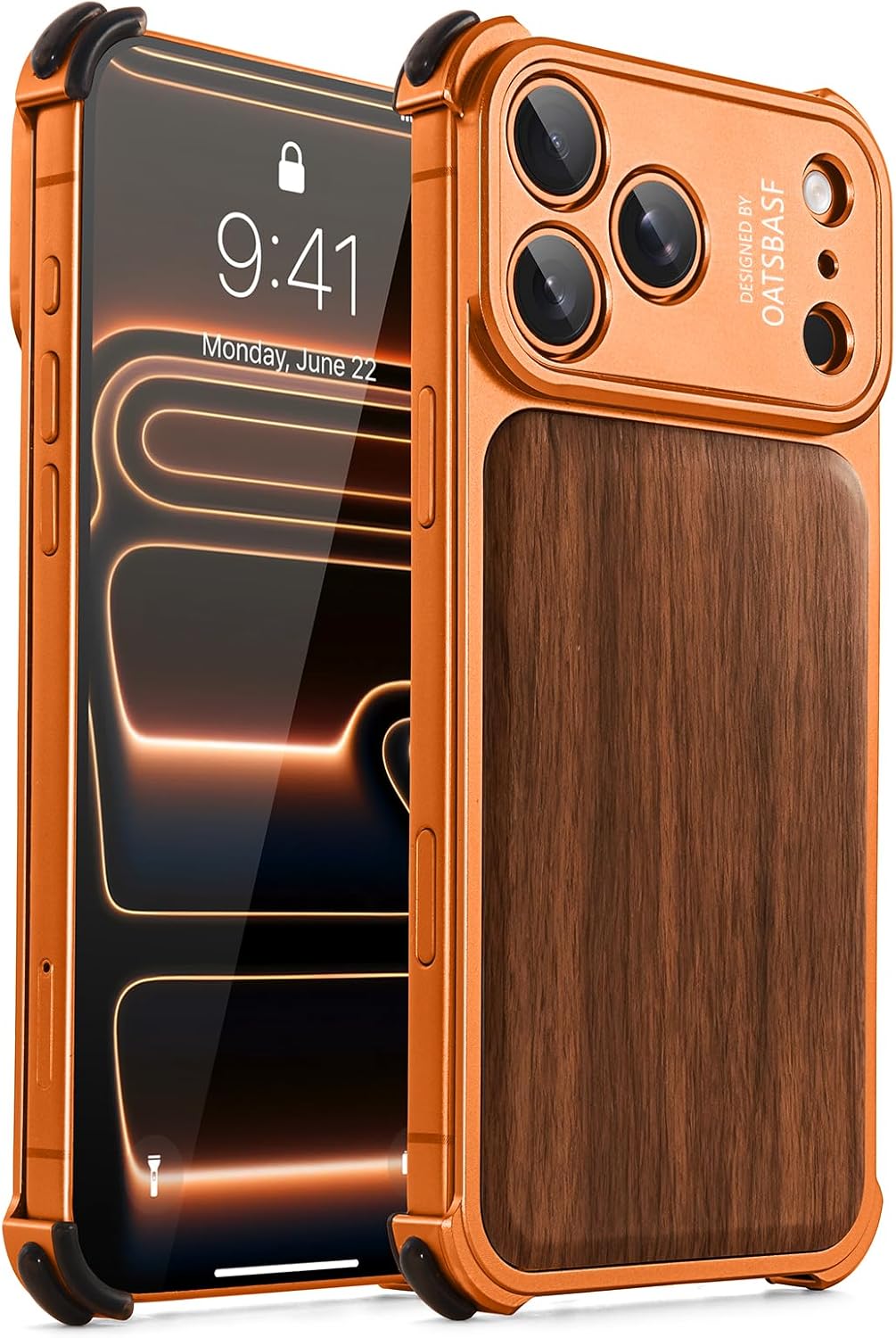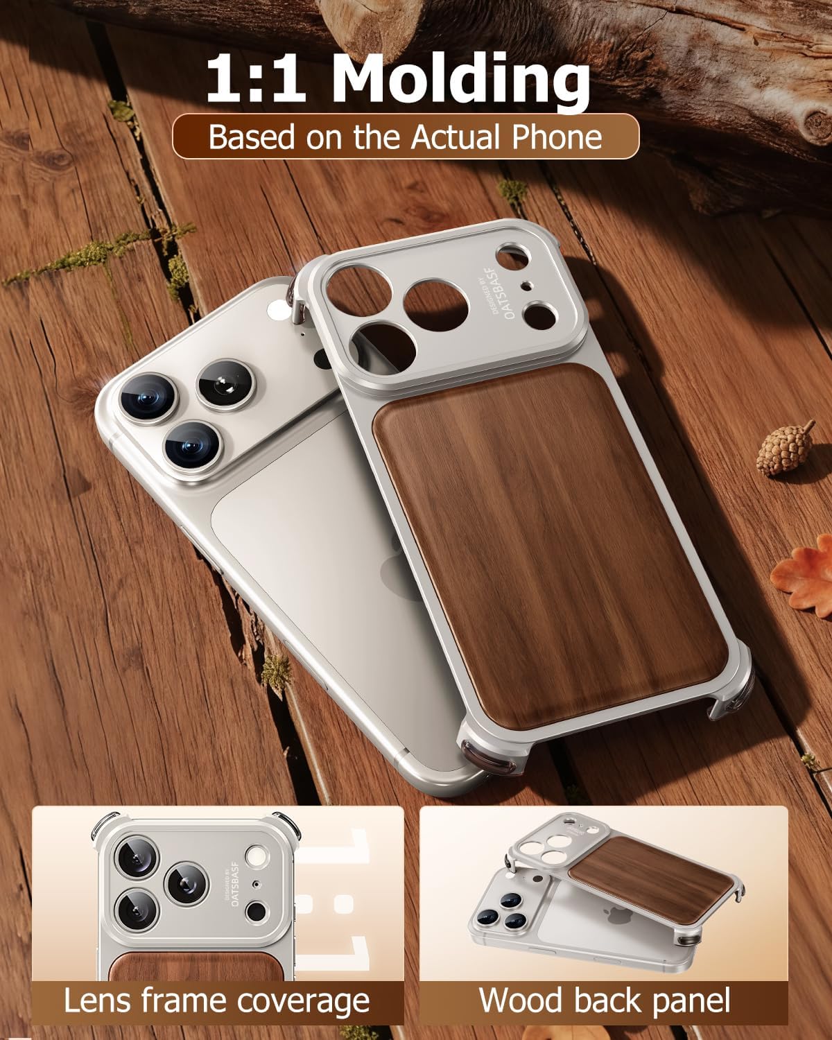 Full Camera Protection, Compatible with MagSafe Charger, Metal Frame Wood Grain Back Panel Phone Case