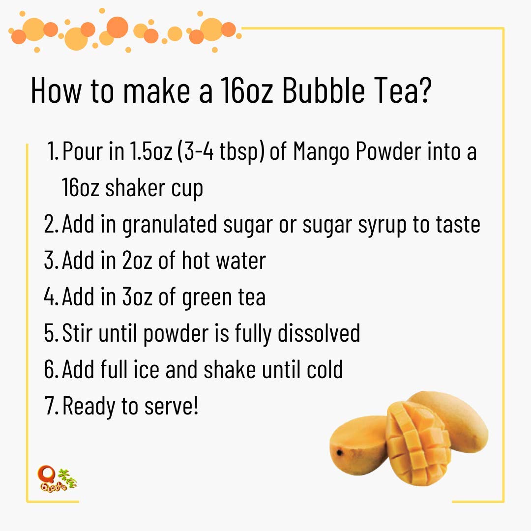High quality instant bubble tea powder, mango flavor. It is 3 in 1, contains mango flavor, non daily creamer and sugar. Simply mix powder with hot water and ice according to our suggested proportion. A bag of tea powder makes approximately 25 cups of 16 ounce drinks.
